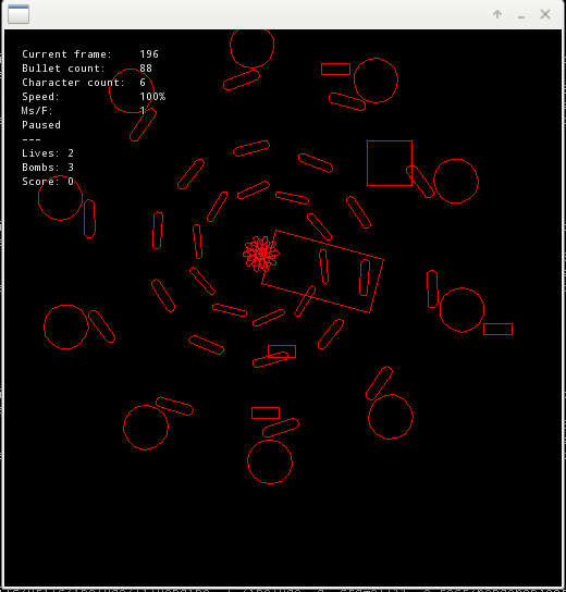 Early vertical scrolling sh'mup prototype. This engine would eventually support scripting with Lua, highly customizable and scriptable bullet patterns with an API similar to Danmakufu, and the ability to record, replay, and rewind gameplay state for ultra-fast bullet pattern script iteration.