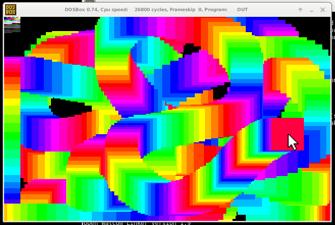 Messing with the Mode 13h palette. I noticed one section of it is already just a cycle through hue values, so I made it loop through those hues while drawing, and also loop the section of the palette itself. The result is magic!