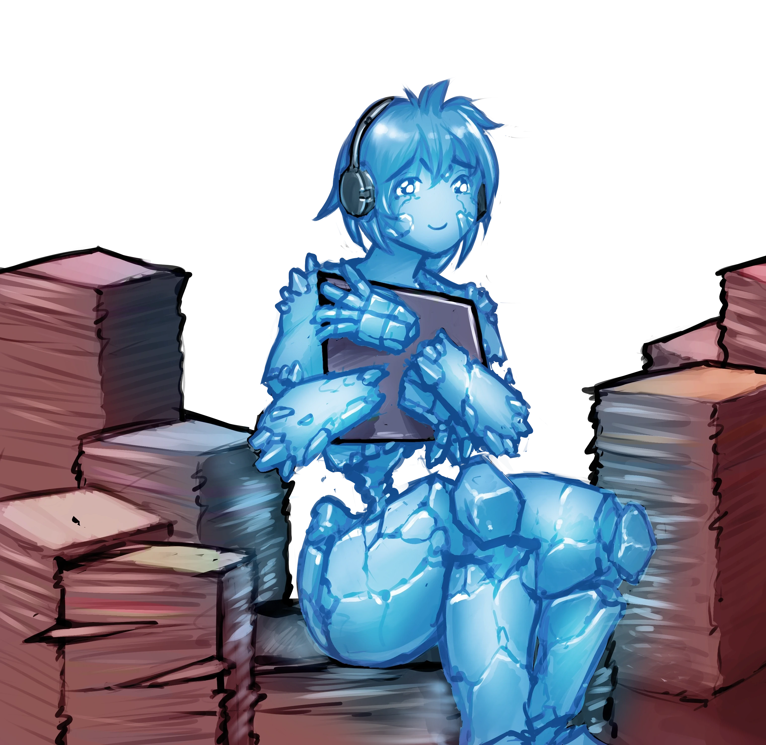 A digital illustration of a woman with a glowing blue holographic body listening to a pile of albums. She is smiling.