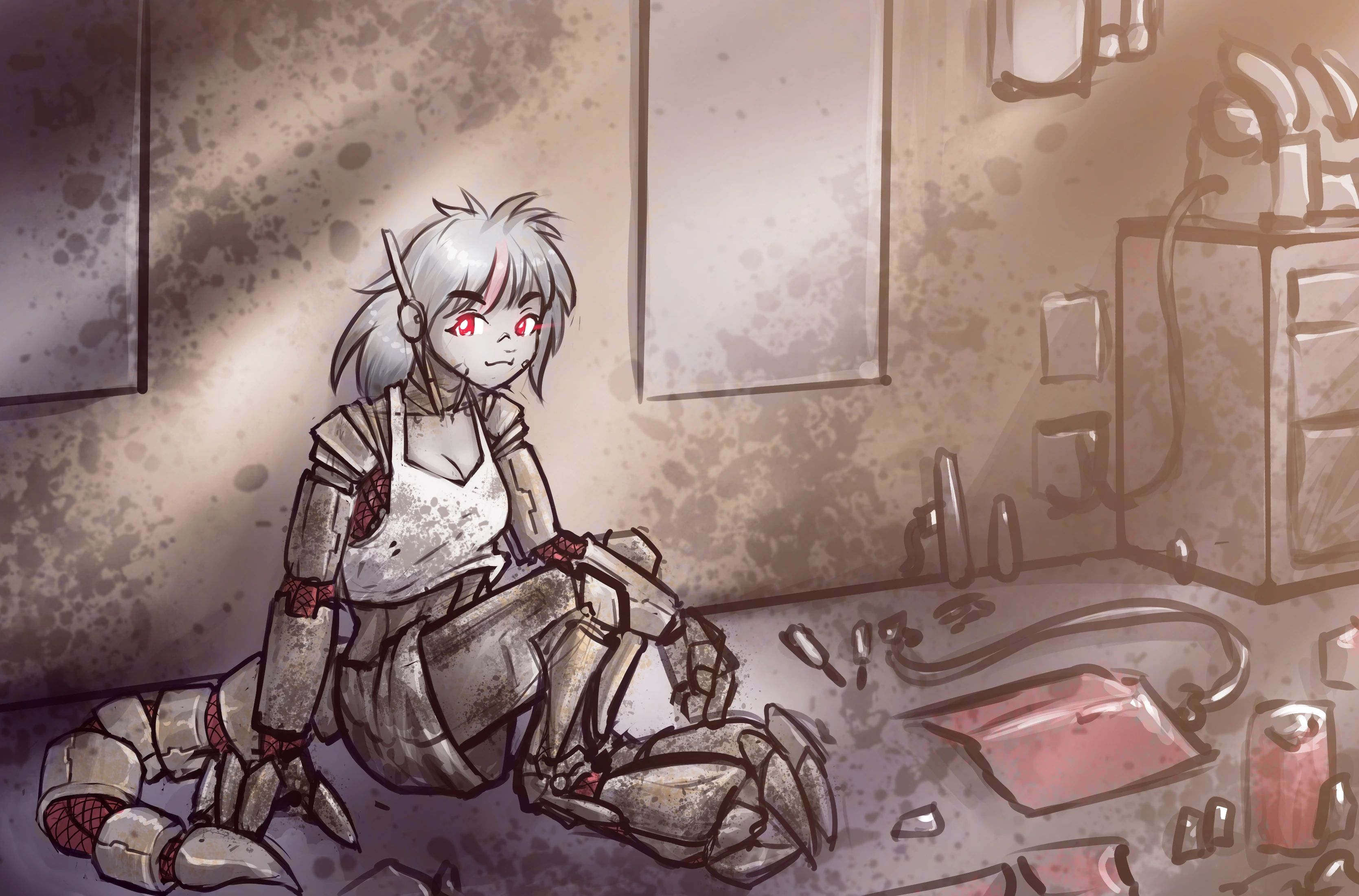A digital illustration of a woman with a robot body sitting against a wall with a pile of parts laid out in front of her.