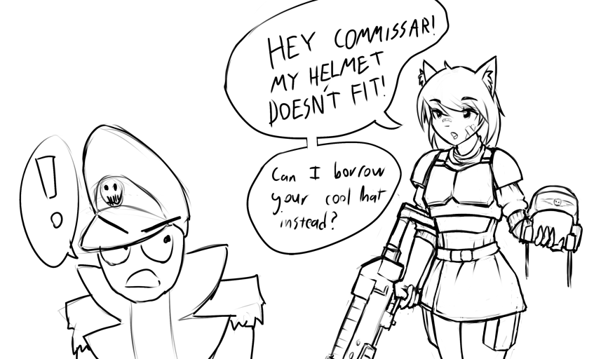 A Felinid Imperial Guard munching on some sardine rations by the dim glow of her plasma gun.